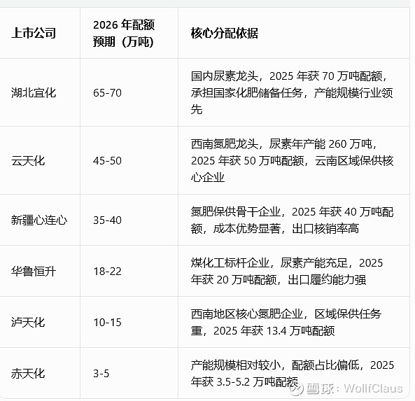 2026 年尿素配额分配延续 “储备任务挂钩、产能规模匹配、保供能力优先” 的核心原则,头部生产企业的配额分配预期如下: