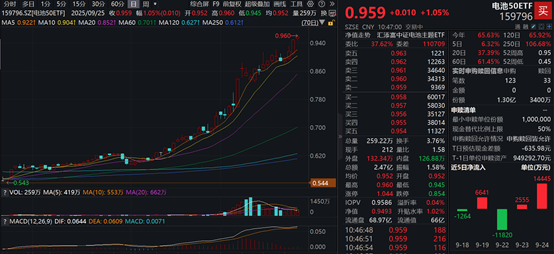 9月25日,电池板块震荡上行,截至10:50,同类规模领先、费率最低档的$电池50ETF(SZ159796)$ 涨超1%,续创阶段新高!资金持续涌入电池50ETF(159796),盘中净申购达1.3亿份!截至9月24日,电池50ETF(159796)最新规模超65亿元,再创新高!