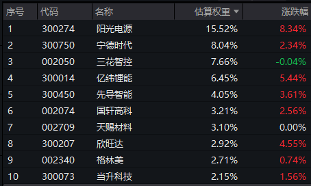 电池50ETF(159796)标的指数成分股多数冲高,逆变器和储能双龙头企业的阳光电源绩后大涨超8%!亿纬锂能涨超5%,欣旺达涨超4%,先导智能涨超3%,宁德时代、国轩高科等涨超2%,格林美、当升科技等强势跟涨,三花智控等回调。