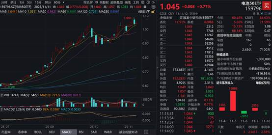 11月11日,A股市场震荡,各板块走势延续分化,建材、电新板块涨幅居前。截至11:14,同类规模领先、费率最低档的$电池50ETF(SZ159796)$ 跳空高开后略有回落,放量涨0.77%,成交额4亿元。资金接连跑步进场,电池50ETF(159796)盘中获净申购1.71亿份,以成交均价计算,合计净流入1.8亿元!