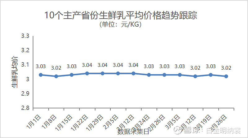 生鲜乳价格暂时企稳,转折暂时没有到来。内蒙古、河北等10个主产省份生鲜乳平均价格3.02元/公斤,比前一周下跌0.3%,同比下跌1.9%。