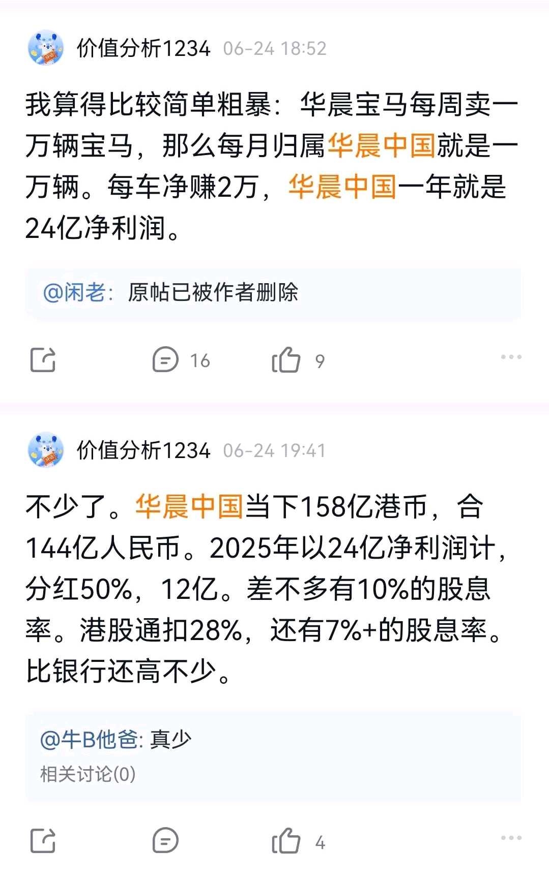 上半年$华晨中国(01114)$ 业绩17亿。有朋友把下半年净利润也算到17亿。我比较保守。我还是以每辆赚2万辆算。我在6月份股价在低位时,就一直保守预计华晨中国的净利润2025年是24亿。那么下半年,保持每月4万,每周1万辆的销量,算法不变,净利润大概在12万!