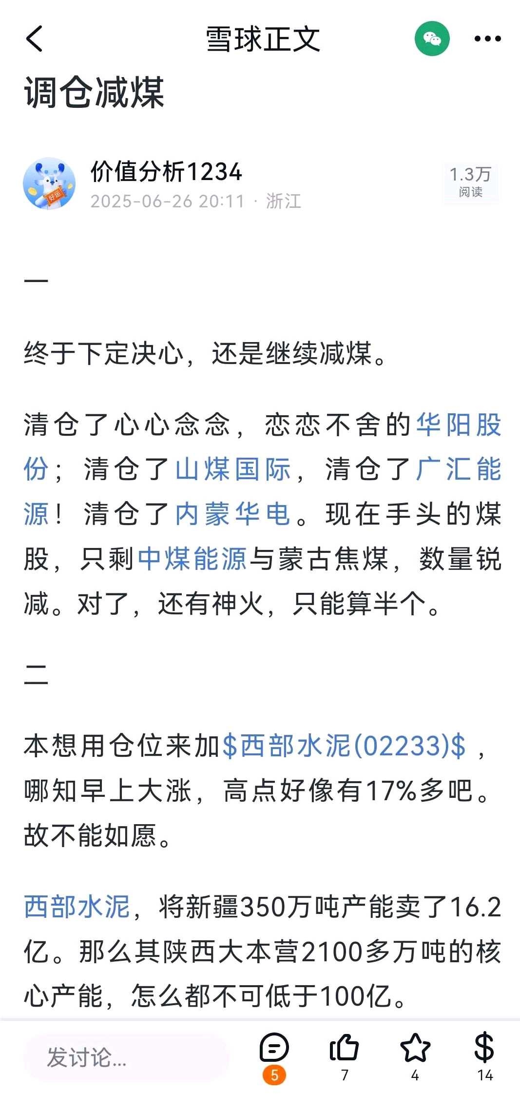 煤与水泥切换,我很顺畅。煤降了,水泥成本降,利润涨,就那么简单。