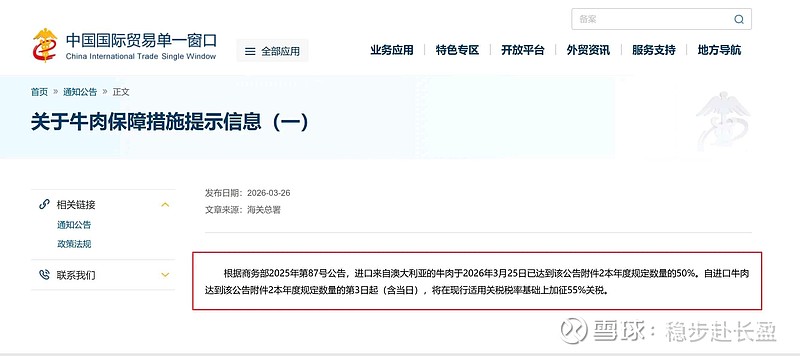 $现代牧业(01117)$ 之前都担心巴西先触及50%,结果澳洲先触及了50%,按这速度,估计六七月这俩的配额基本就用完了,今年肉牛价格还是很值得期待的,尤其秋冬季牛肉消费高峰,进口配额基本用完。对应牧场的淘牛价格和牛犊价格会继续不错。