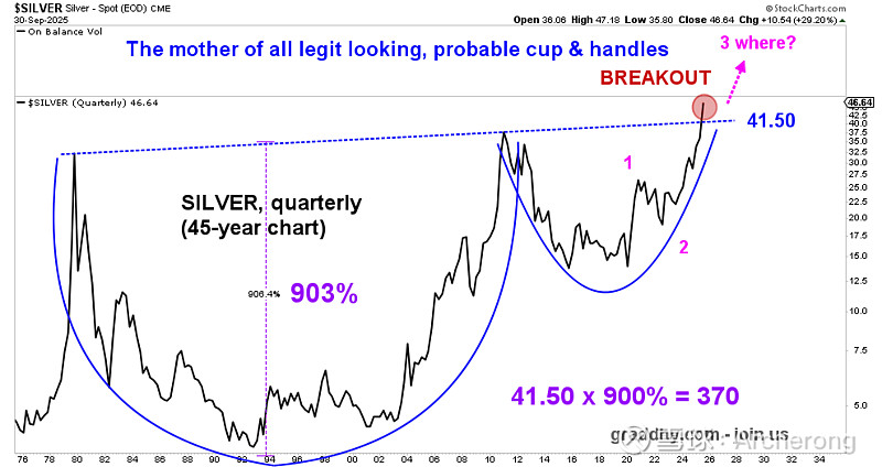 昨天是本季度的最后一天。这意味着白银价格已经突破了45年的杯柄线。