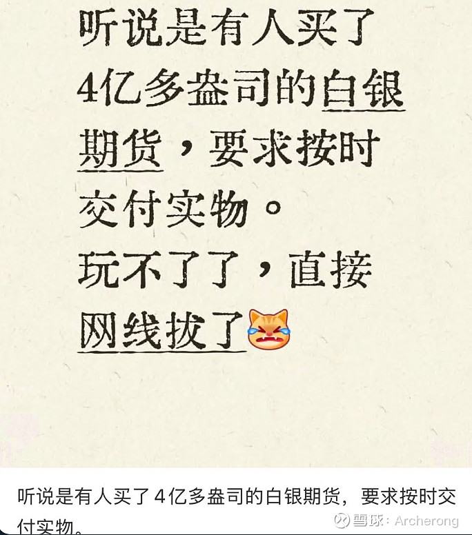 来自国内的消息称,COMEX(或LBMA,或两者兼有)的一份授权协议原本承诺交割4亿金衡盎司(约12441公吨)的实物白银。但银行家们并没有选择违约,而是CME直接叫停了交易,他们正在琢磨下一步该怎么办。