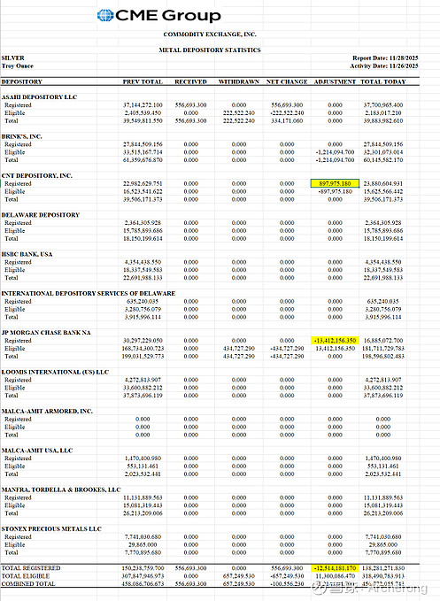 同时纽约商品交易所白银库存警报:2025年11月26日,超过8.3%或1250万盎司的白银从纽约商品交易所注册库存类别中转移出来。这些是期货合约的支撑盎司。