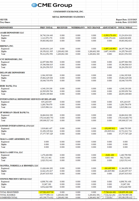 昨日又有772.6万盎司白银从注册类别(用于支持期货合约)转移至合格类别。这是白银移除的典型途径。自2025年10月9日以来,已有5350万盎司白银从注册类别移除,另有6790万盎司白银从存管机构移除。