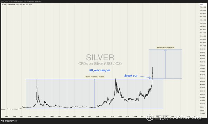 白银方面突破50年沉睡期意义重大。沉睡时间越长,涨势越强劲。