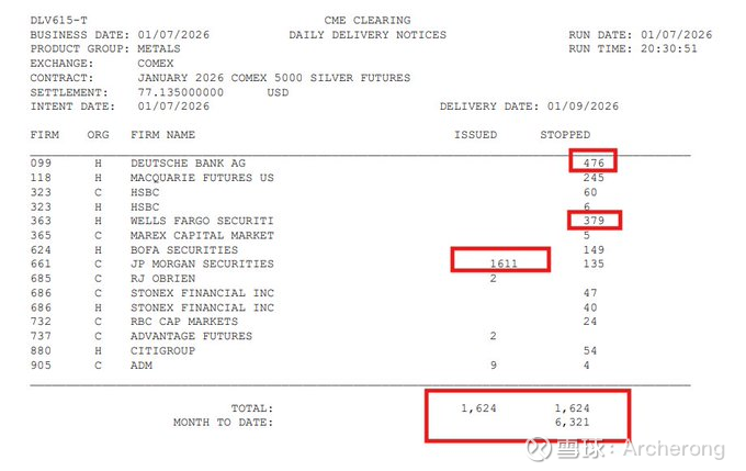 纽约商品交易所1月白银交割最新消息:摩根大通发出1611份白银交割通知,涉及805.5万盎司白银,将于1月9日交割!