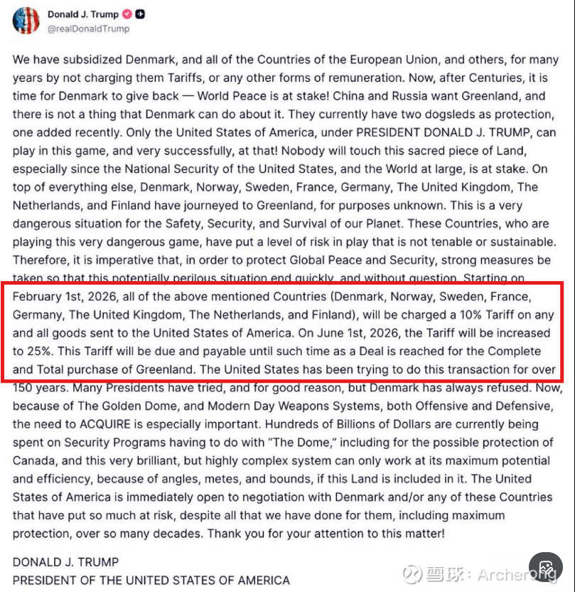 特朗普宣布, 自2月1日起,对所有来自反对美国购买格陵兰的8个英国和欧盟国家丹麦、挪威、瑞典、法国、德国、荷兰和芬兰的进口商品加征10%关税,