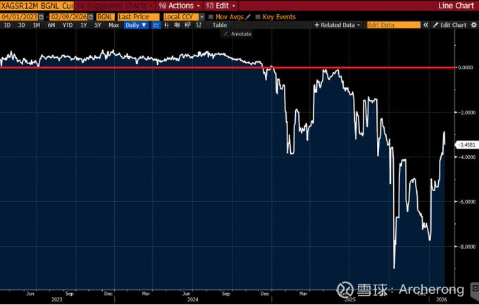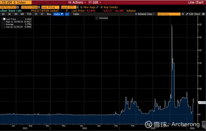 另一种体现白银供应紧张程度的方法,也验证了现货紧缺。一年期白银互换价格减去美国利率,实际上是在说:我不在乎白银的纸面价格是多少。我需要实物白银,而且是现在就需要。