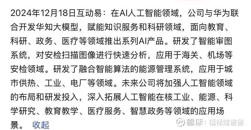 2024年12月18日互动易:在AI人工智能领域,公司与华为联合开发华知大模型,赋能知识服务和科研领域,面向教育、科研、政务、医疗等领域推出系列AI产品。研发了智能审图系统,对安检扫描图像进行快速分析,应用于海关、机场等安检领域。研发了融合智能算法的能源管理系统,应用于城市供热、工业、电厂等领域。未来公司将加强人工智能领域的布局和研发投入,深入拓展人工智能在核工业、能源、科学研究、教育教学、医疗服务、智慧政务等领域的应用场景。$同方股份(SH600100)$