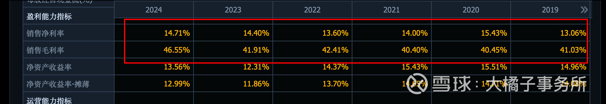 40%+ 毛利率,15% 净利率,利润率太稳了,而且小幅增长。毛利率 2025 年到了接近 50%。40 亿收入,15% 利润率是 6 亿利润。