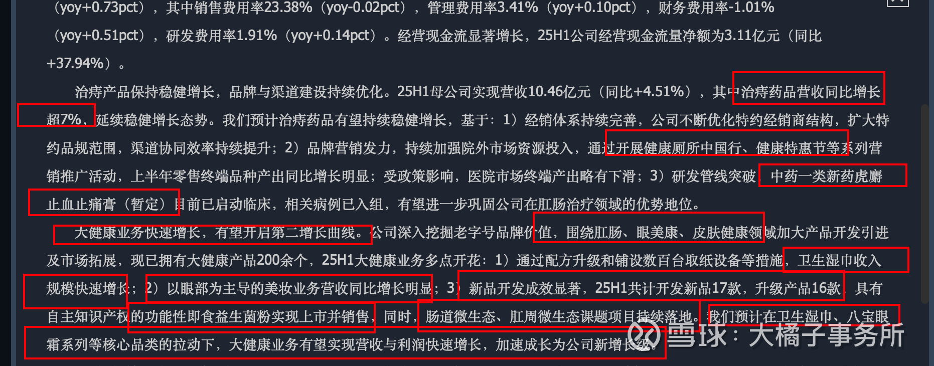 大健康业务快速增长,有望开启第二增长曲线。公司深入挖掘老字号品牌价值,围绕肛肠、眼美康、皮肤健康领域加大产品开发引进及市场拓展,现已拥有大健康产品200余个,25H1大健康业务多点开花:1)通过配方升级和铺设数百台取纸设备等措施,卫生湿巾收入规模快速增长;2)以眼部为主导的美妆业务营收同比增长明显;3)新品开发成效显著,25H1共计开发新品17款,升级产品16款,具有自主知识产权的功能性即食益生菌粉实现上市并销售,同时,肠道微生态、肛周微生态课题项目持续落地。我们预计在卫生湿巾、八宝眼霜系列等核心品类的拉动下,大健康业务有望实现营收与利润快速增长,加速成长为公司新增长级。