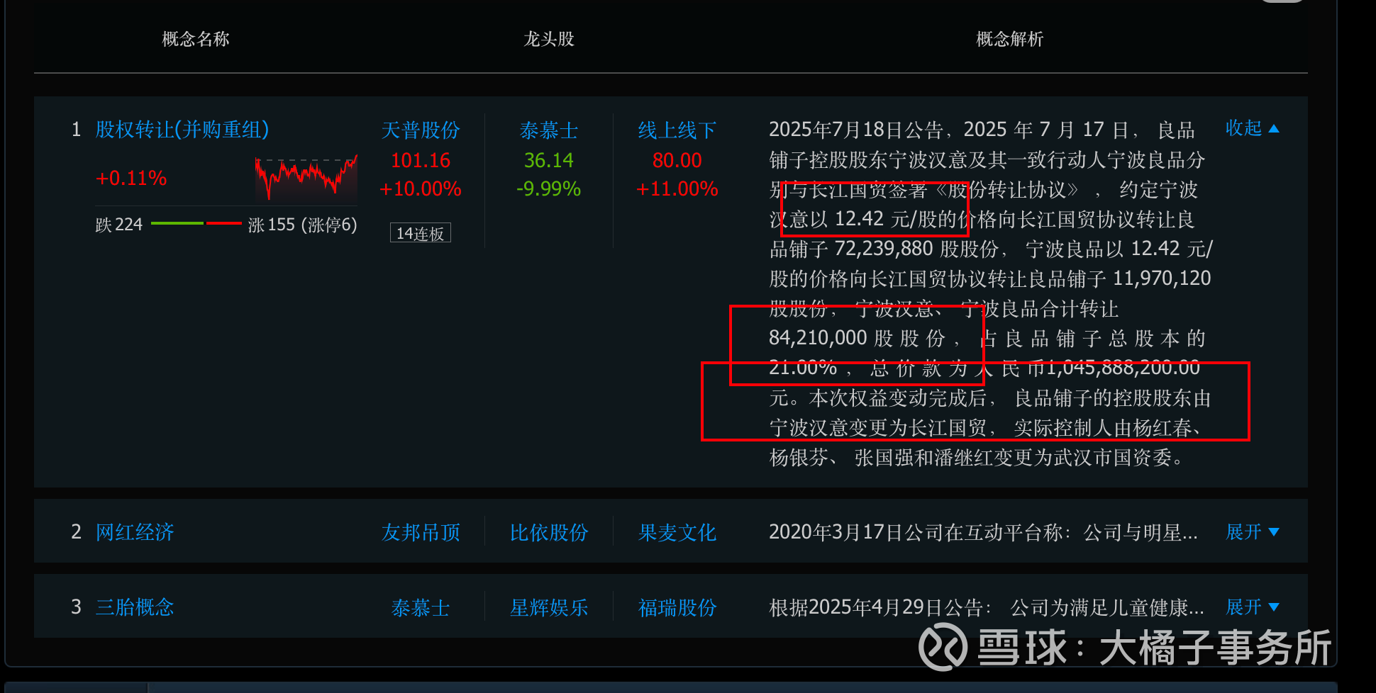 大消费链条,泰慕士、宏辉果蔬、煌上煌等,已经涨的好的,就有转让重组的加成。未来可能发生的比如金枫酒业、红棉股份等等。