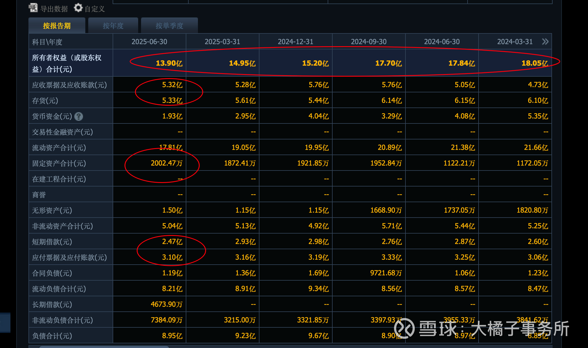 权益下降到了 14 亿:轻固定资产,重应收和存货,负债多,家底差。