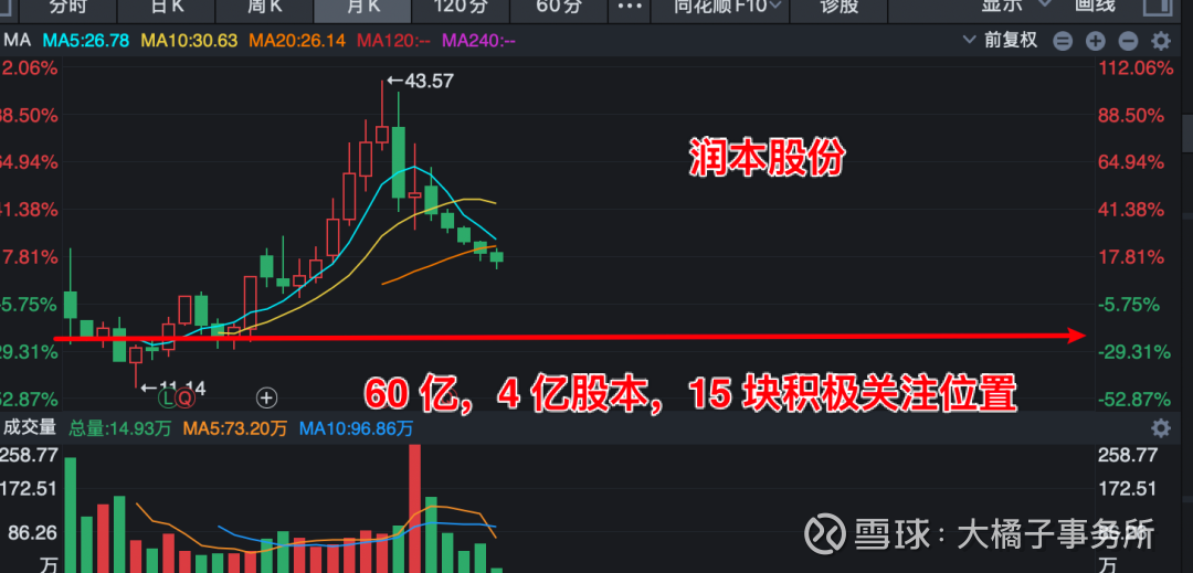 60 亿市值,4 亿股本,15 块积极关注的位置。润本是契合大橘子投资体系的,当前差一个好价格,差股东数走向极致的冷清。