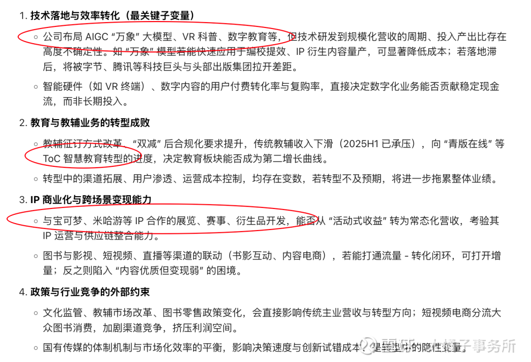 发展变量:谷子经济是重点。未来 1-2 年是转型关键期,若能快速实现 AIGC 降本、教育业务用户破圈、IP 变现规模化,城市传媒将完成新旧动能切换;反之,将长期受困于传统业务萎缩、新业务难盈利的困境,与行业头部的差距进一步扩大。