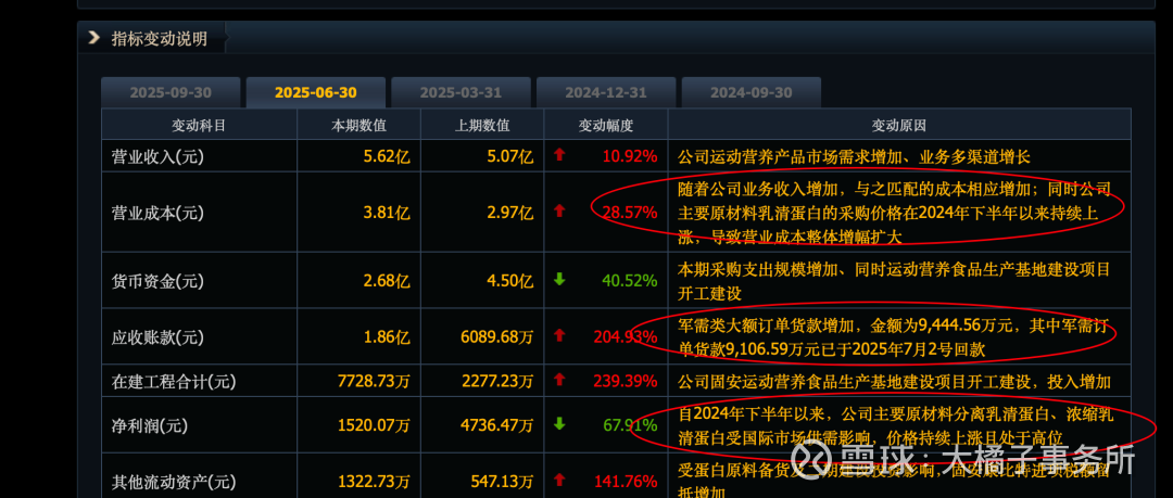 公司主要原材料乳清蛋白的采购价格在 2024 年下半年以来持续上涨,导致营业成本整体增幅扩大。
