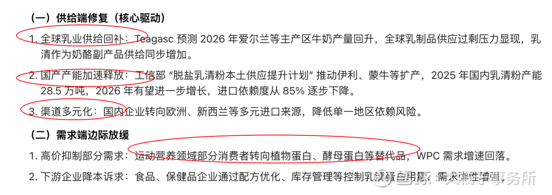 2026 年康比特乳清蛋白采购成本大概率呈现 “前高后低、逐季改善” 的格局,全年同比有望回落 10%—15%,但难以回到 2024 年上半年的低位;核心驱动是全球乳业供给恢复、国产产能释放与需求边际放缓,同时需警惕疫病、关税、能源等变量扰动。