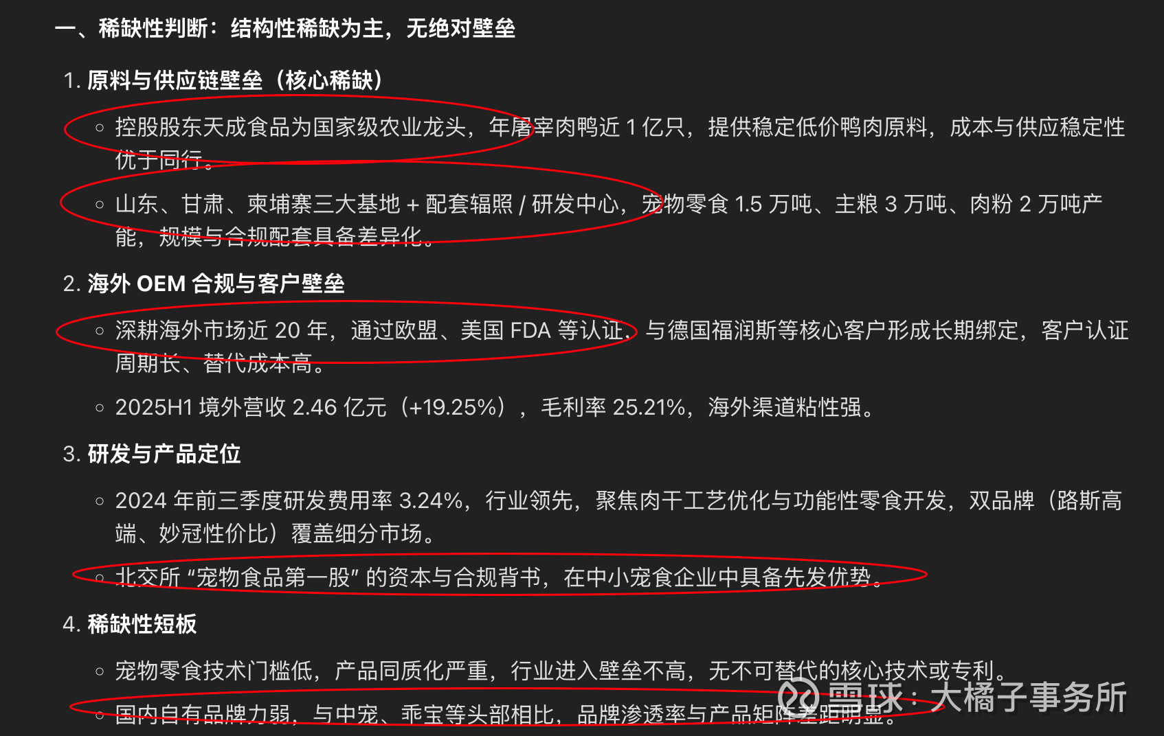 竞争激烈的市场,不稀缺,普通企业,优秀胜在了小和辨识度,北交宠物食品第一股:路斯股份的稀缺性集中在原料供应链、海外合规与产能配套,属于结构性优势而非绝对壁垒;国内外竞争均激烈,零食赛道可依托成本与渠道错位竞争,主粮市场需突破品牌与技术瓶颈。若能强化原料成本优势、加速国内品牌建设并提升海外高附加值订单占比,其竞争地位有望进一步提升。
