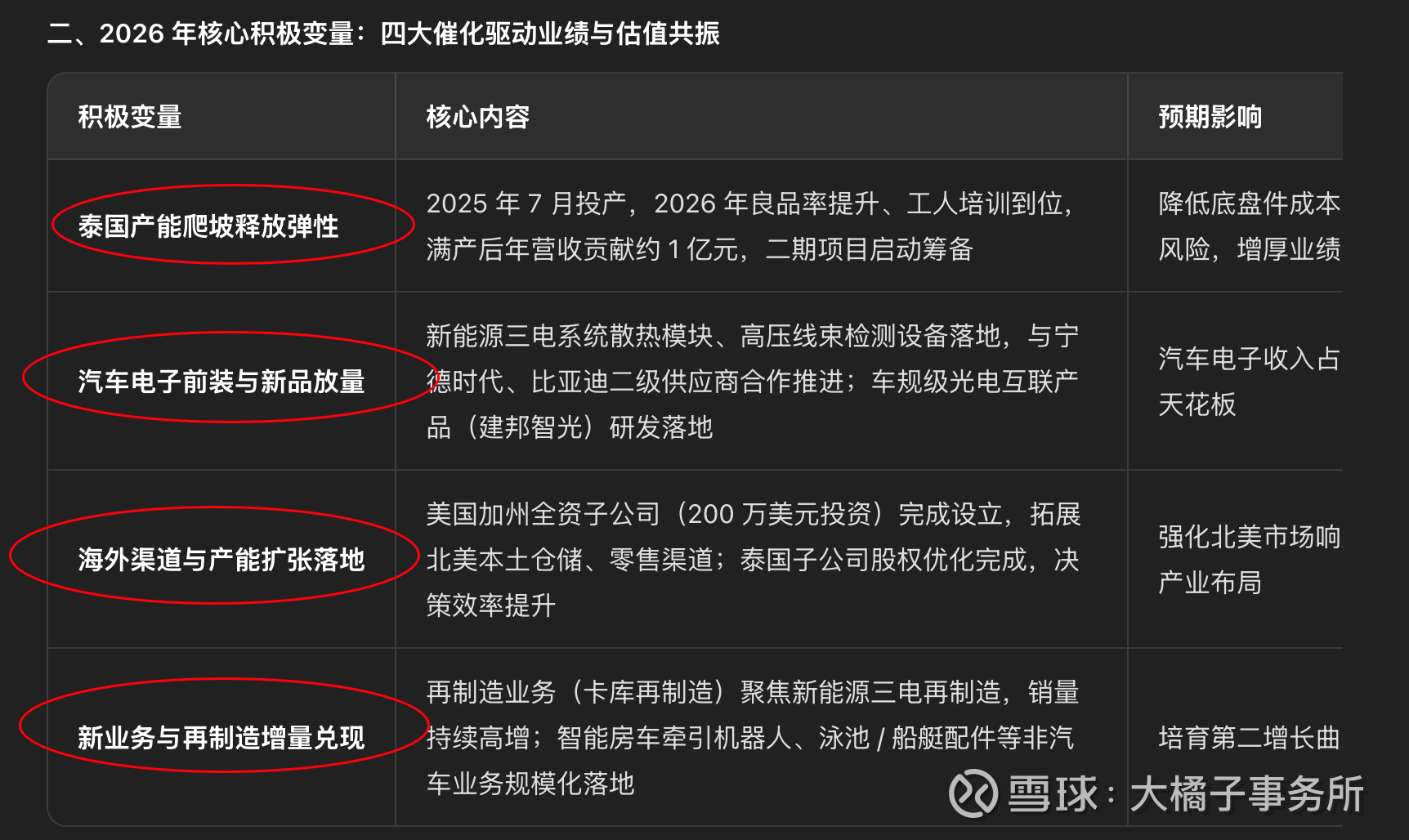 2026 年积极变量集中于泰国产能爬坡、汽车电子前装放量、海外渠道扩张、再制造与新业务落地,是业绩与估值双升的关键催化期。