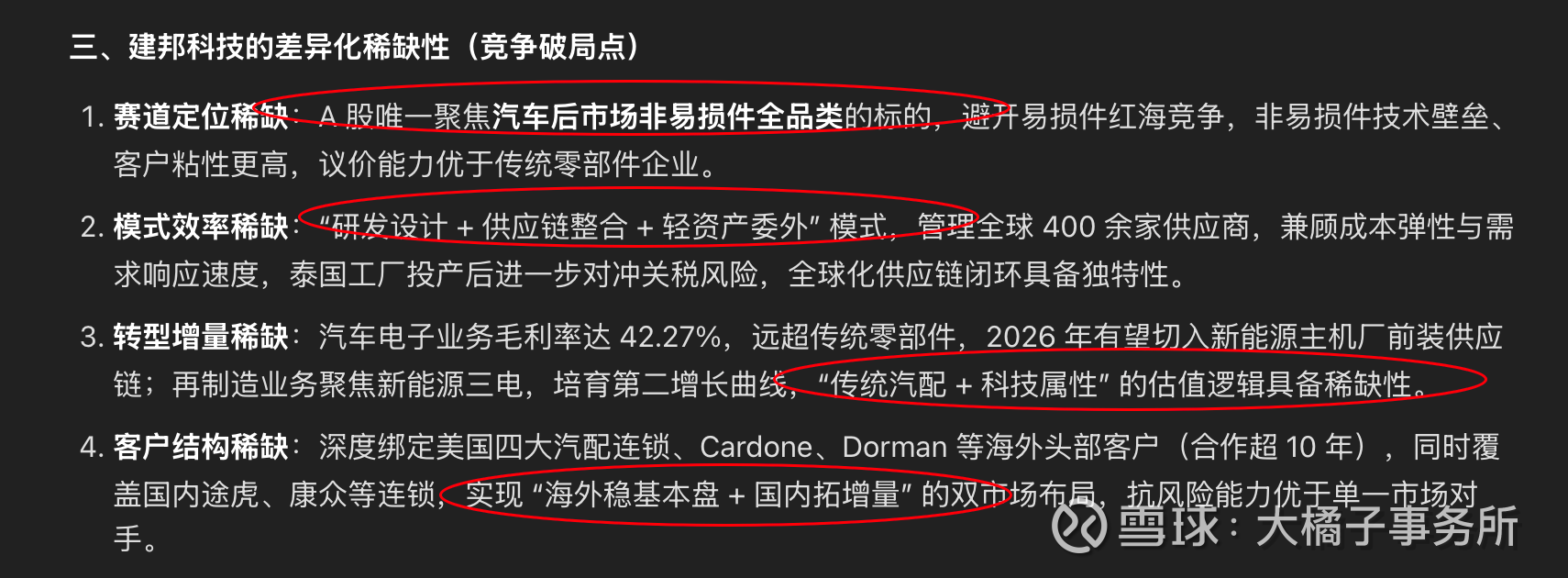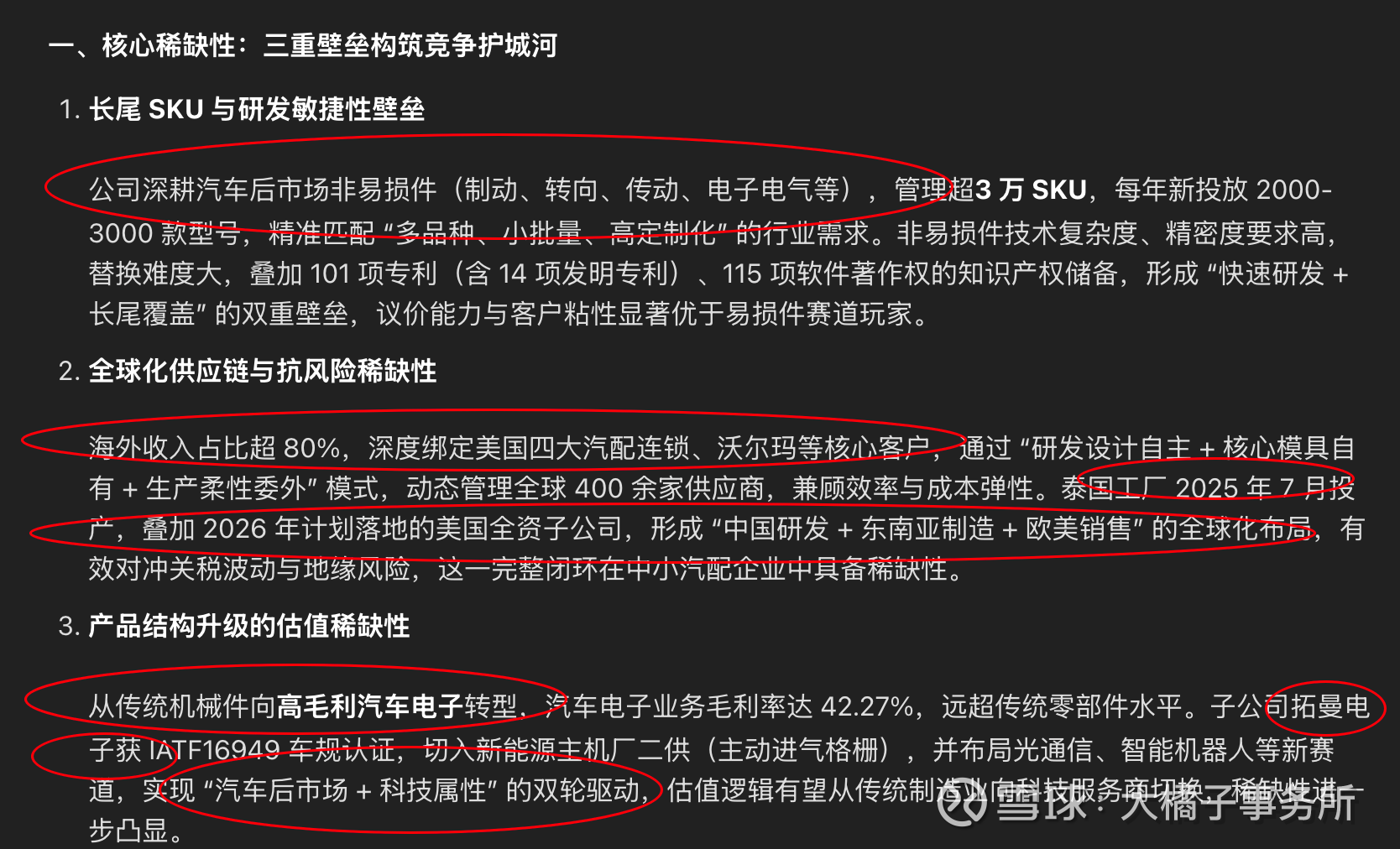 稀缺性体现:汽车后市场非易损件的长尾 SKU 壁垒、全球化供应链韧性、高毛利汽车电子转型三大维度。做具有国际竞争力的中国汽车售后市场领导者。
