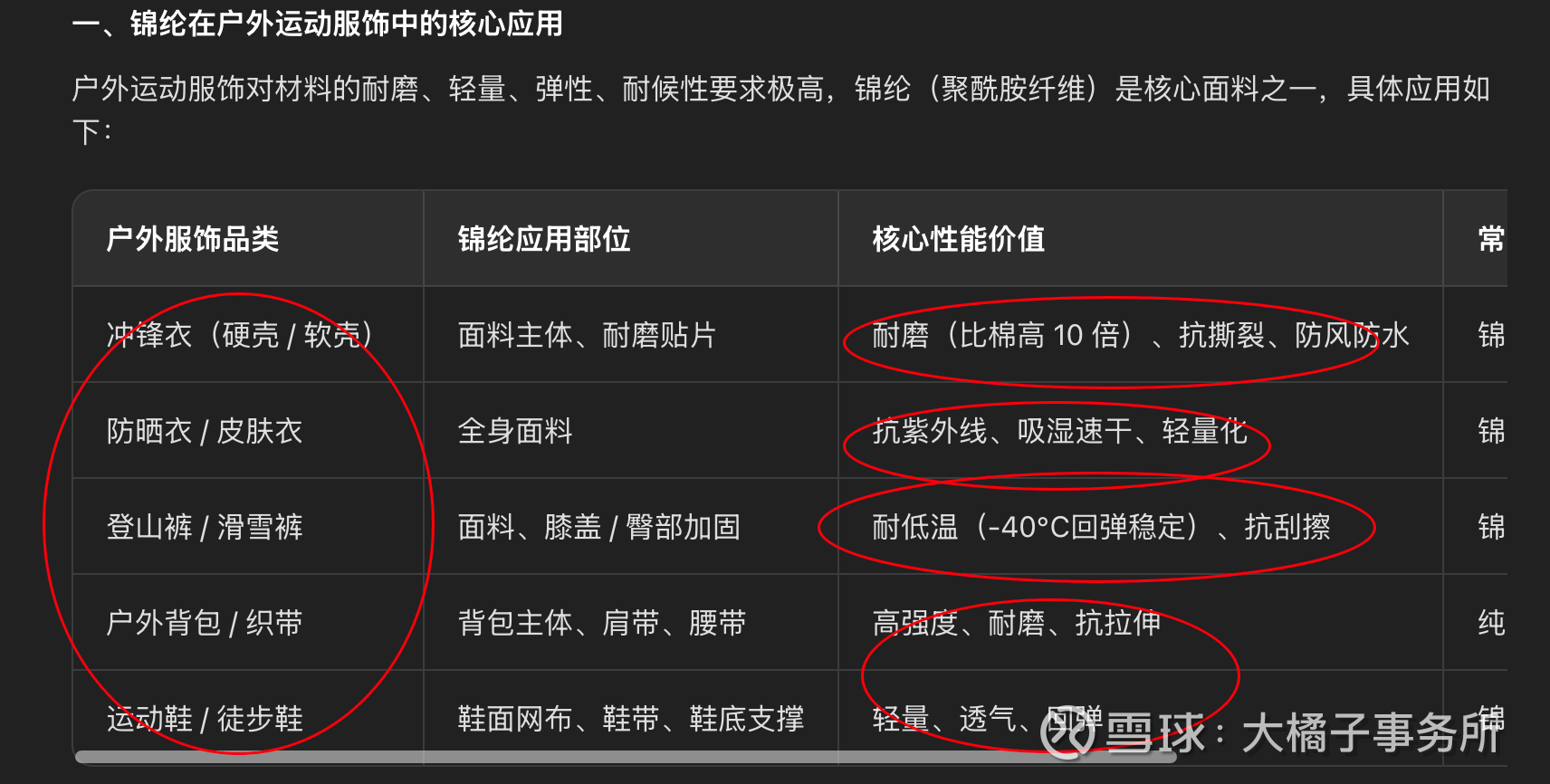 户外运动服饰大量使用锦纶,因其耐磨、轻量、回弹与耐低温等特性完美适配户外场景。