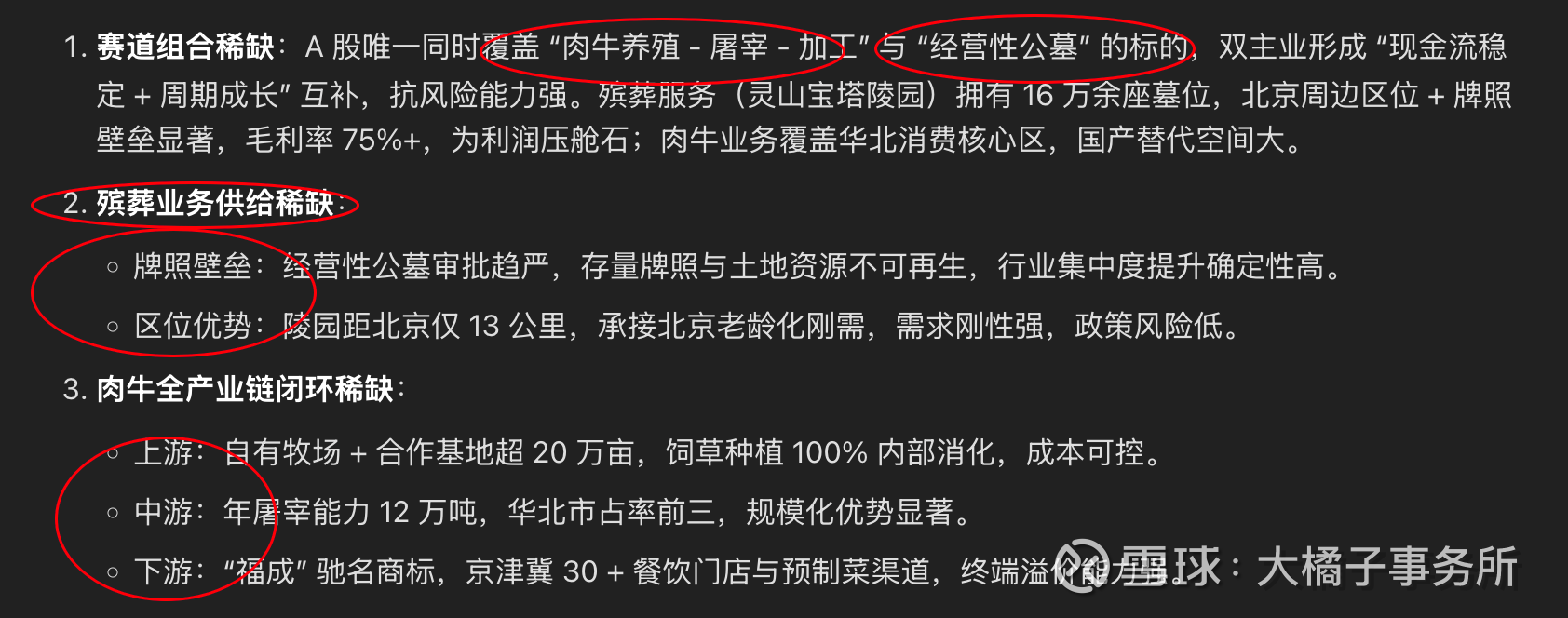 稀缺性支撑 2 倍溢价的基础: A 股唯一 “肉牛全产业链 + 殡葬服务” 双赛道标的,叠加殡葬牌照与土地资源、肉牛全产业链闭环、区位与品牌三大壁垒,形成供给端不可复制的竞争优势。