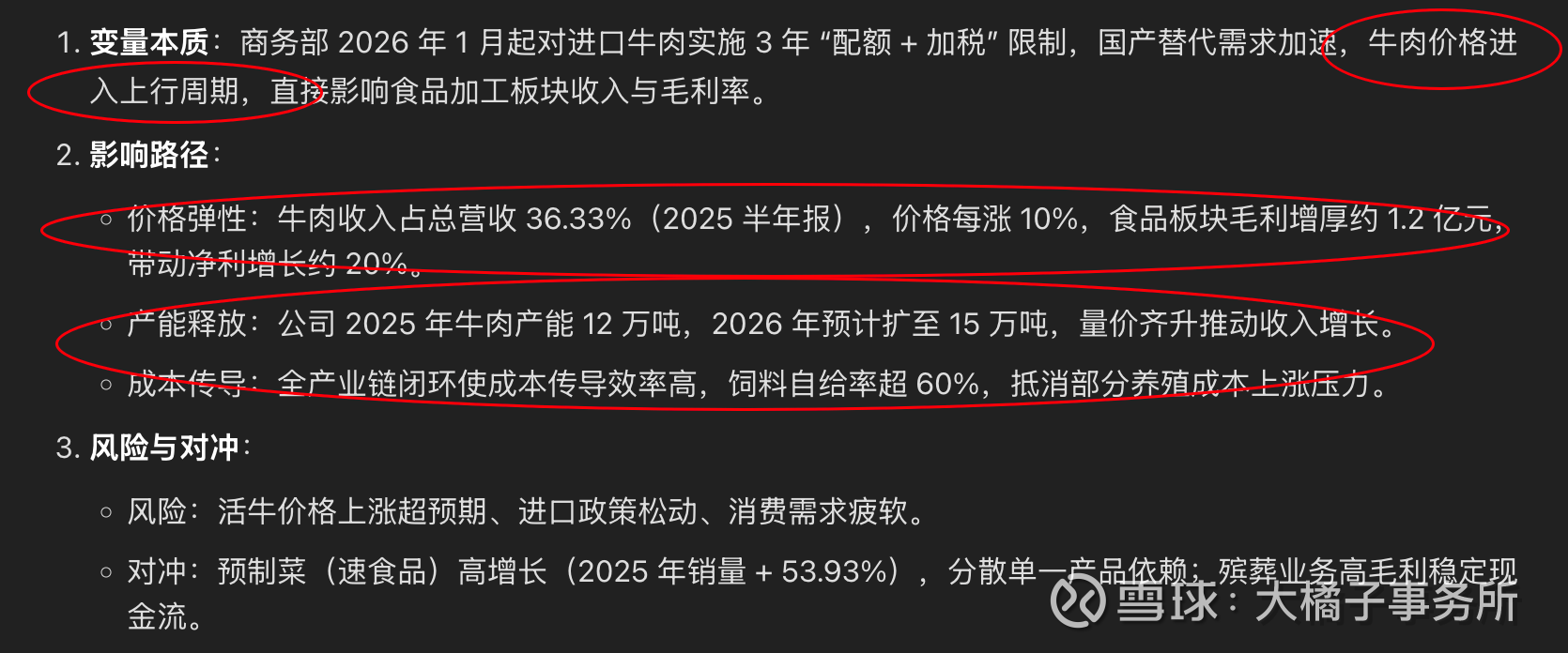 2026 发展变量挖掘:2026 年最大变量是牛肉价格周期与进口政策带来的业绩弹性,同时殡葬政策调整、预制菜放量与成本管控是关键影响因子。