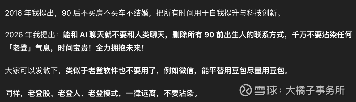 孙宇chen在 X 上关于 AI 说过这样一段话:核心点在于,2026 年以后,能和 AI 聊天就不要和人类聊天,千万不要沾染任何「老登」气息,时间宝贵!全力拥抱未来!老登股、老登人、老登模式,一律远离,不要沾染。