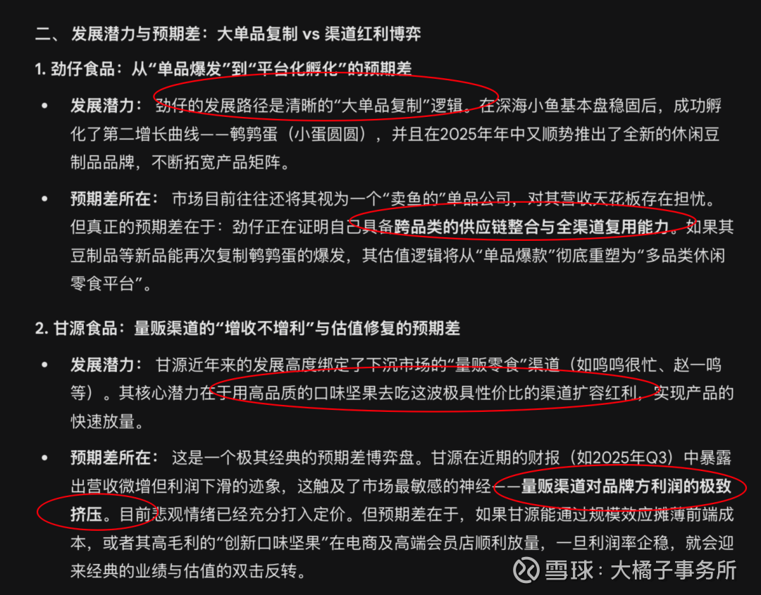 做预期博弈的,潜在弹性可能更大的,看甘源(甘源食品更具博弈价值。短期受困于渠道利润挤压,但一旦越过这道坎,巨大的预期差会带来可观的向上空间)。持续关注。