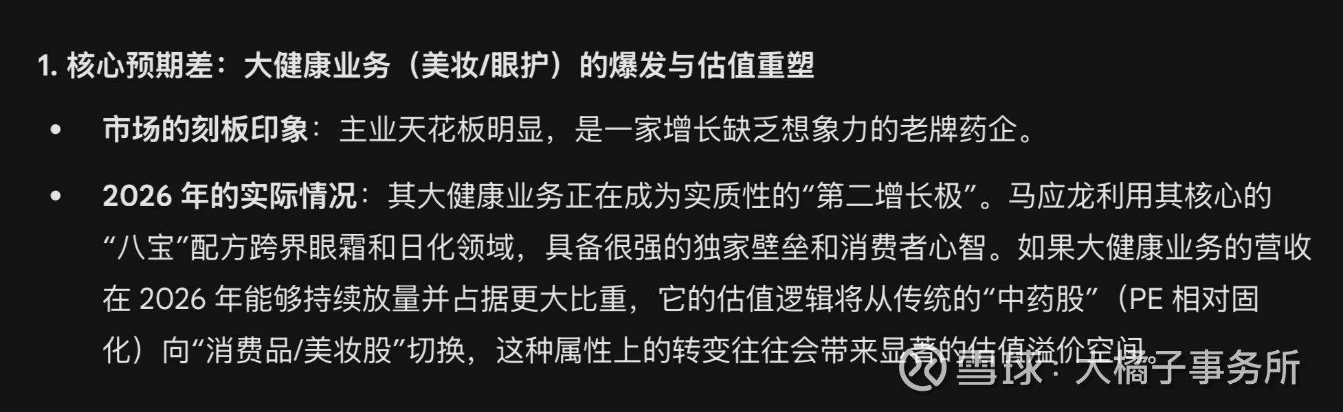 马应龙利用其核心的“八宝”配方跨界眼霜和日化领域,具备很强的独家壁垒和消费者心智。如果大健康业务的营收在 2026 年能够持续放量并占据更大比重,它的估值逻辑将从传统的“中药股”(PE 相对固化)向“消费品/美妆股”切换,这种属性上的转变往往会带来显著的估值溢价空间。