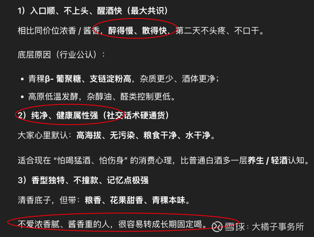 青稞酒的关键共识:醒酒快、不上头、酒体干净、香型独特、健康加分。