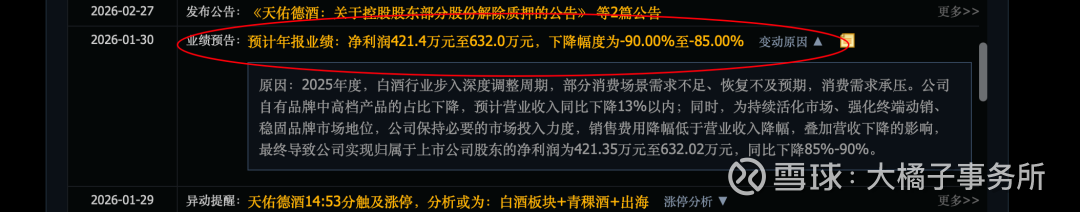潜在风险点需要权衡:2026 年天佑德集团(天佑德酒大股东)自身财务不健康、经营压力大:非酒业务持续亏损、资金链紧绷、质押率高、依赖减持 / 质押循环;仅靠上市公司股权 “续命”,无明显改善迹象。