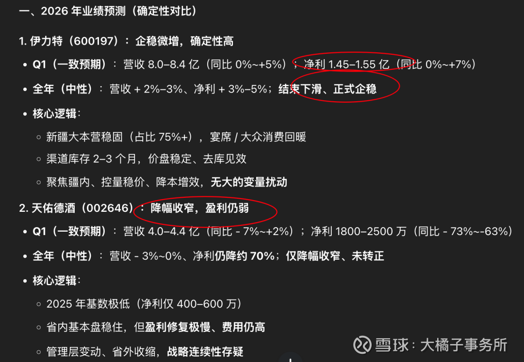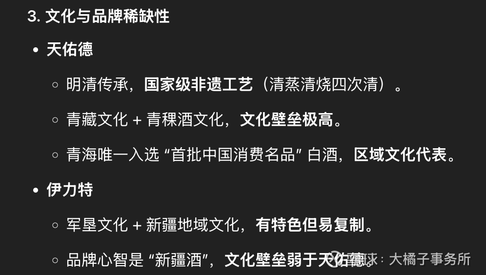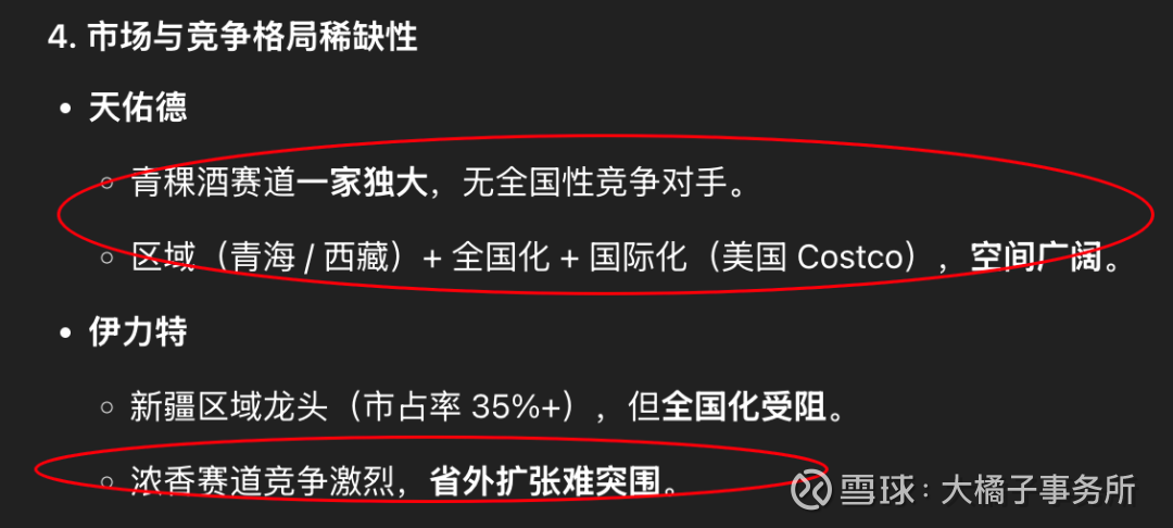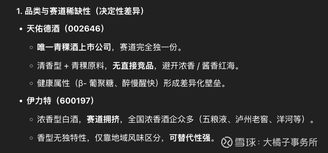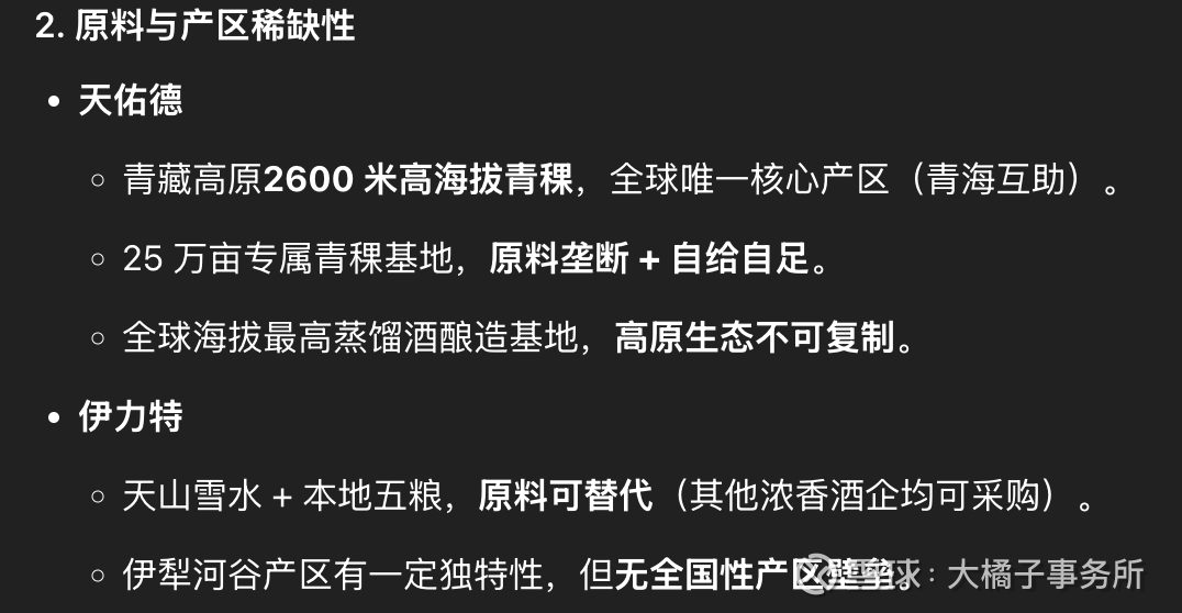 稀缺比较:天佑德是品类 + 产区 + 原料 + 文化四重稀缺,几乎无直接竞品;伊力特是区域龙头 + 浓香赛道,稀缺性主要在地域垄断,香型与全国浓香酒同质化严重。