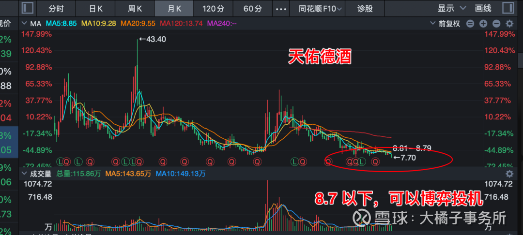 在关键的情绪节点(悲观到极致,稍微有点利好就能突突一下子),做投机博弈,是更好的决策思路。从这个视角出发,天佑德酒是更好的选择。30-40 亿市值,可以关注。仅供参考。