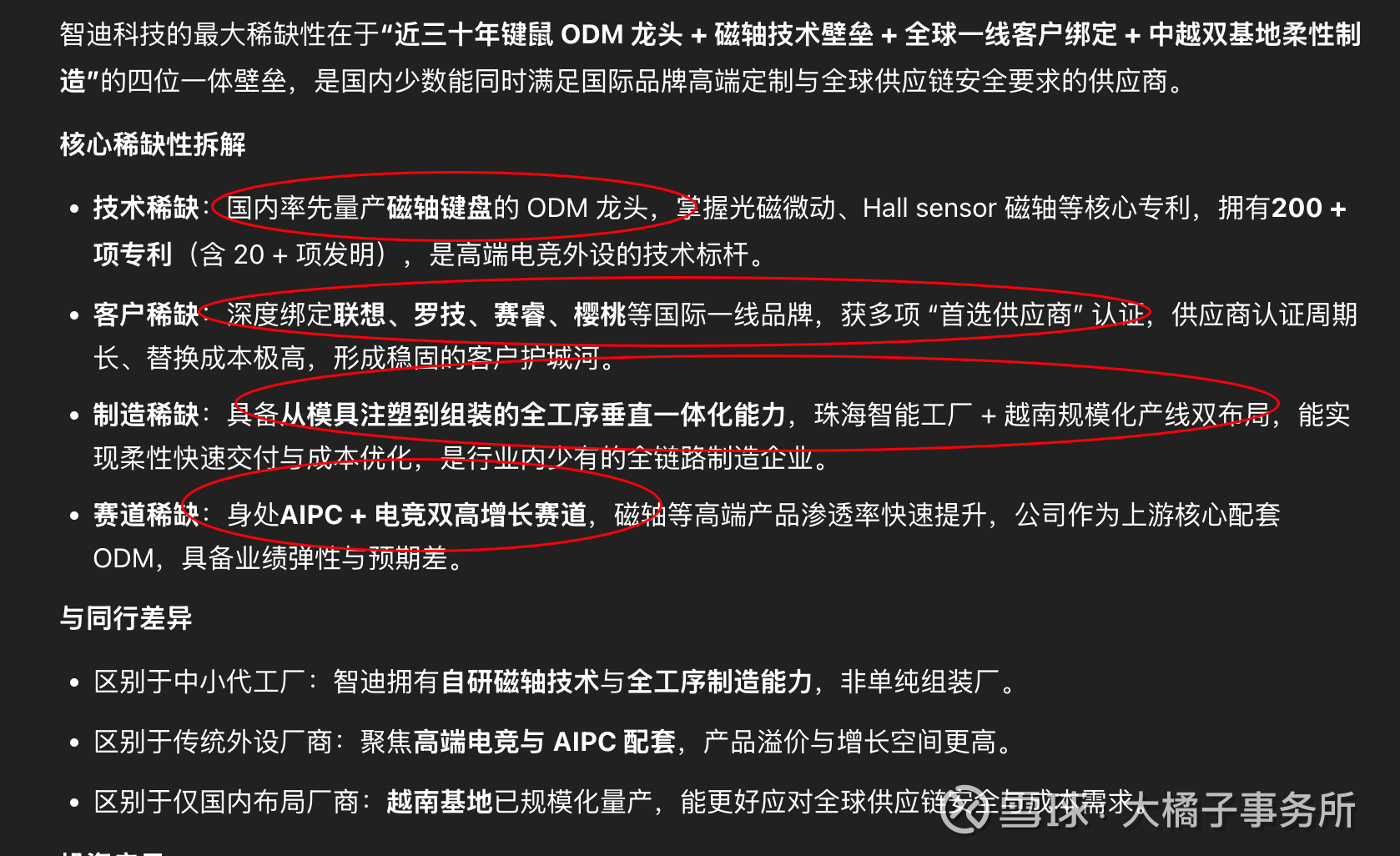 稀缺性:键鼠 ODM 龙头 + 磁轴技术壁垒 + 全球一线客户绑定 + 中越双基地柔性制造”的四位一体壁垒,是国内少数能同时满足国际品牌高端定制与全球供应链安全要求的供应商。