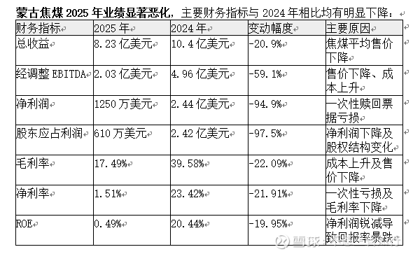收益与EBITDA大幅下滑:蒙古焦煤2025年总收益为8.23亿美元,较2024年的10.4亿美元下降20.9%。经调整EBITDA为2.03亿美元,同比下降59.1%。这主要归因于焦煤平均售价的大幅下降,以及运输成本增加、生态保证金等额外成本上升。