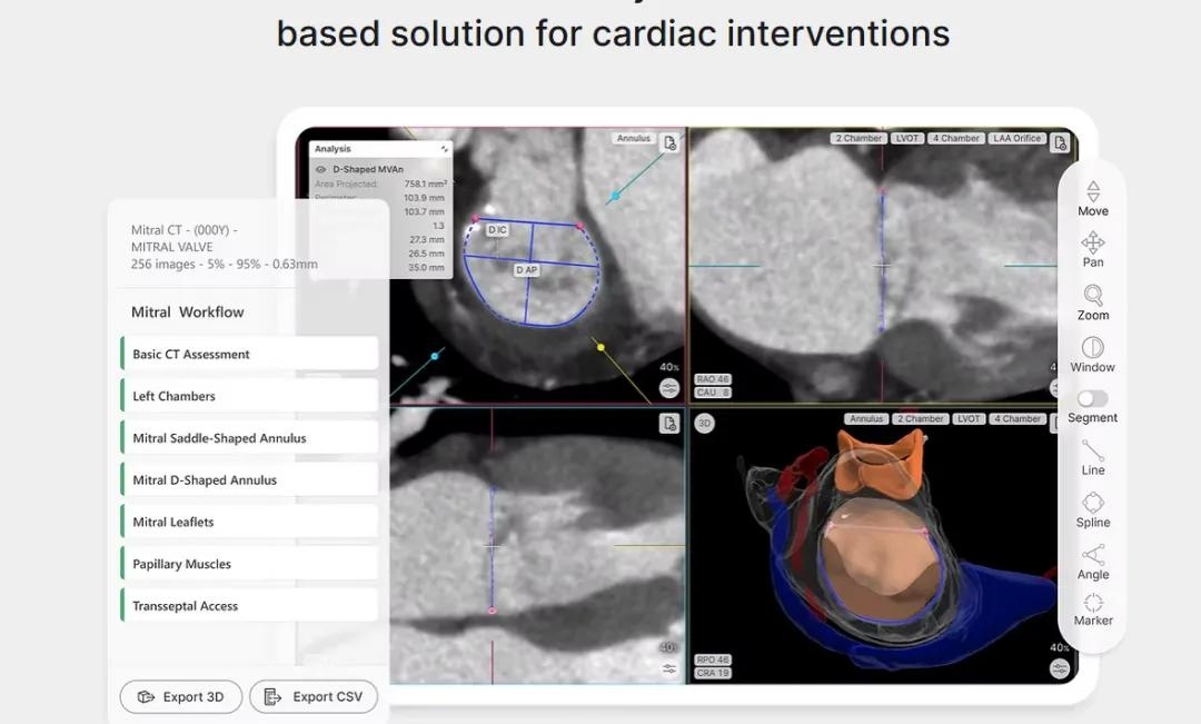 2025年4月16日,其核心产品LARALAB获美国FDA 510(k)认证(注册证号K242500),成为全球首个覆盖多瓣膜结构(主动脉瓣、二尖瓣、三尖瓣及心腔相关结构)的全自动AI影像平台。该平台基于深度学习算法,通过确定性算法对CT影像进行自动分割与测量,生成3D解剖模型并量化瓣环尺寸、角度及空间关系,实现从影像导入到手术规划的“端到端自动化”,将传统人工测量20-40分钟的流程缩短至2-3分钟,且结果与人工测量高度一致。