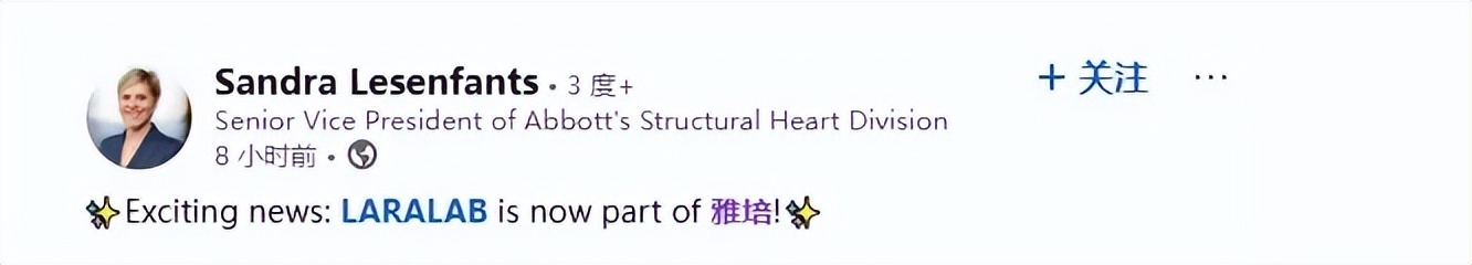 2025年10月9日,雅培(Abbott)结构性心脏事业部高级副总裁Sandra Lesenfants在领英发布声明,正式宣布将德国慕尼黑医疗人工智能(AI)影像公司Laralab纳入数字化组合。此次收购未披露具体金额,但标志着雅培在结构性心脏病领域的系统化数字布局迈入新阶段——从器械研发到AI影像分析、术前规划的闭环生态构建。
