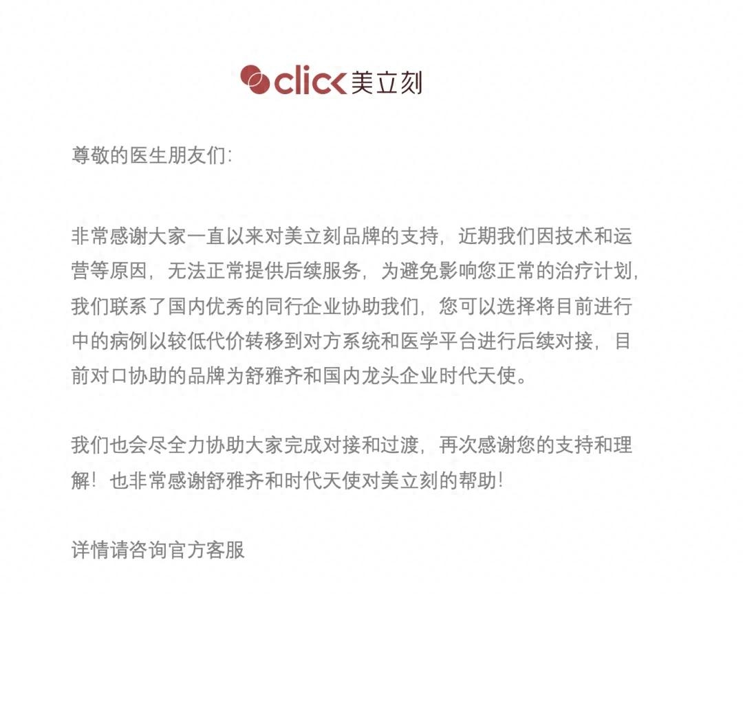 通知明确提及,美立刻品牌运营主体北京缔佳医疗器械有限公司因 “技术和运营等原因”,已无法正常提供后续服务,为保障患者治疗连续性,已协调舒雅齐与行业龙头时代天使承接在治病例,患者可 “以较低代价转移至上述两家企业的系统和医学平台进行后续对接”。