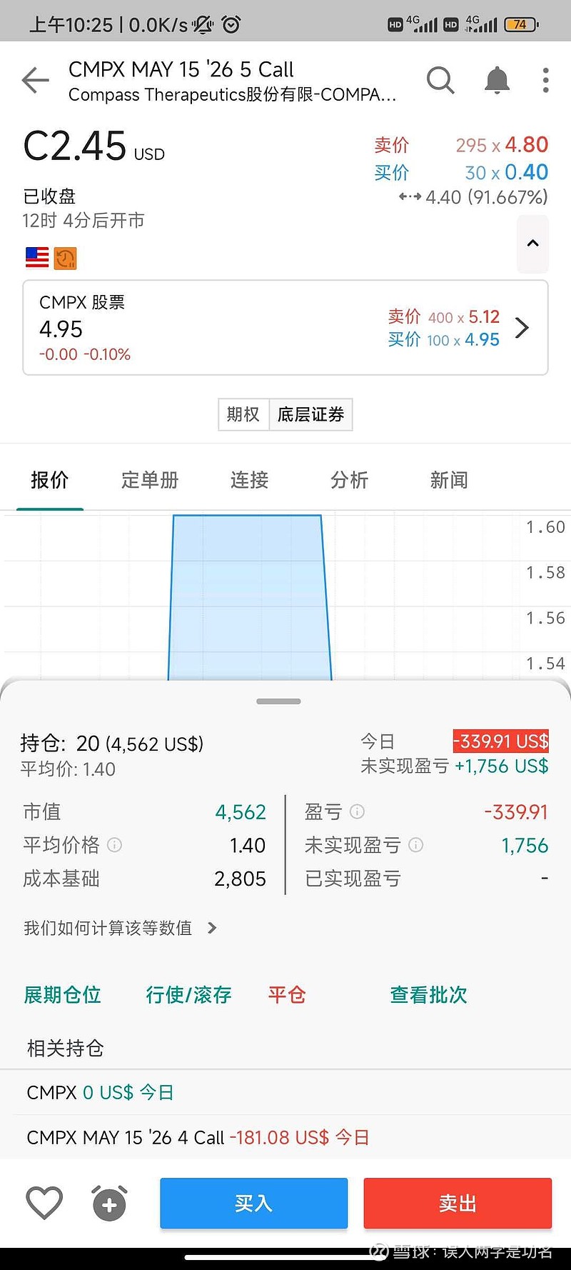 $Compass Therapeutics(CMPX)$ 有的call想想真是太有性价比,可惜总是等错过了才知道珍惜,拍断大腿买的太少了当时。现在只能多花近一倍的价格,2刀多去买同期的4刀价位的call,虽然盈亏点与1刀多去买5刀价位的call都是在6刀左右,但同样的投入本金(赌三期失败了都会清零),成功的收益率可能是差两倍。