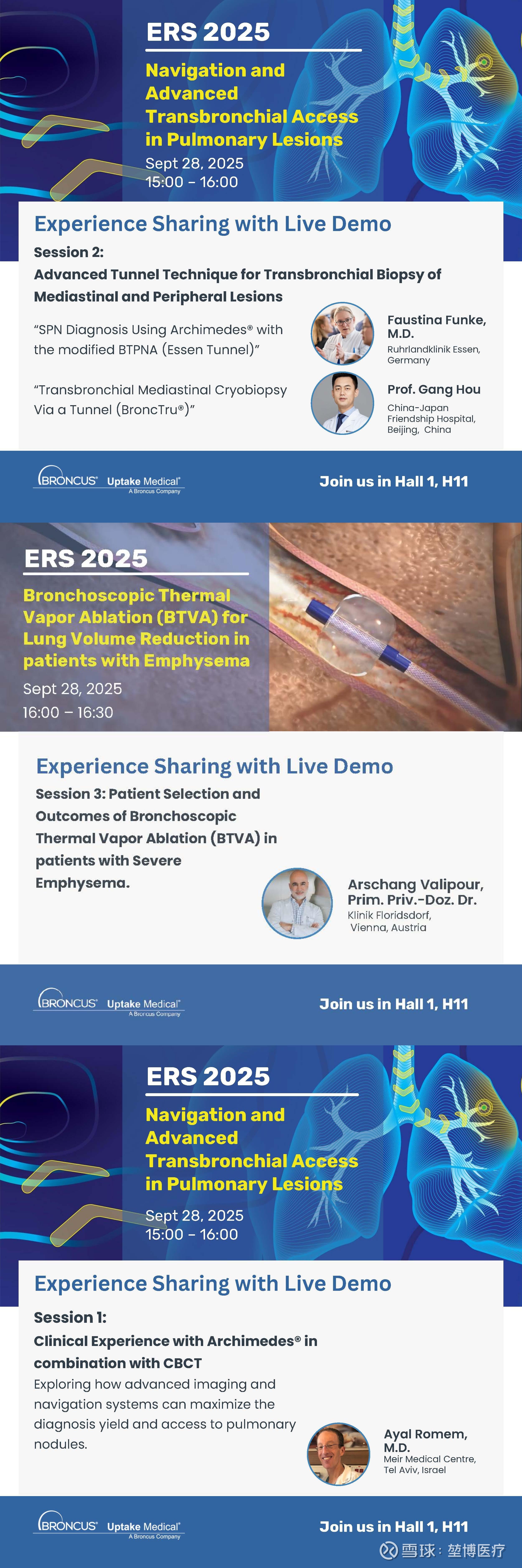 近年来,中国在呼吸介入领域的各项创新在ERS舞台上愈发亮眼,越来越多的中国声音正在定义全球呼吸介入的未来。本次会议,众多临床专家将分享其应用堃博医疗呼吸介入解决方案在肺小结节诊断、慢阻肺治疗等场景中的经验。