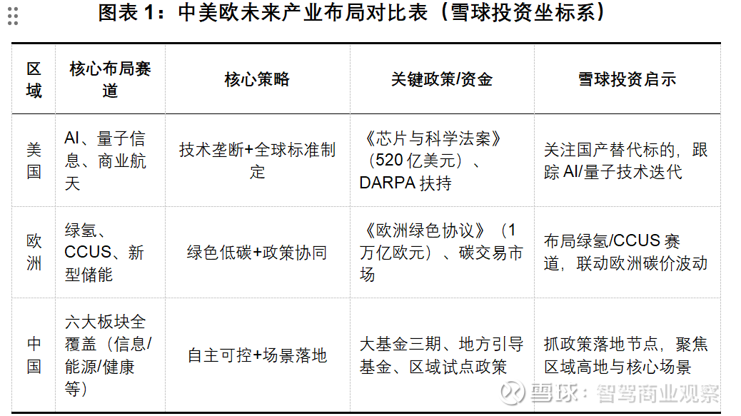 图表解读:这张表是判断全球赛道机会的核心工具。比如球友关注量子计算赛道,可对比中美布局——美国侧重底层技术,国内侧重应用落地,因此可优先选择国内有试点场景、政策支持的标的;若关注绿氢,欧洲的技术与政策进度可作为国内赛道的前瞻信号。