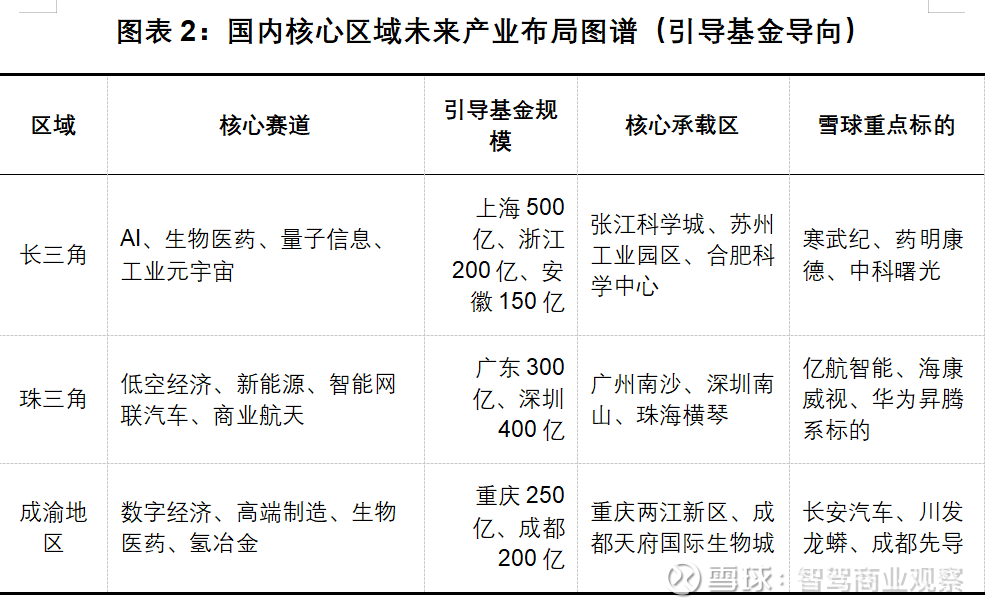 二、国内主线:区域产业高地崛起,跟着引导基金找机会 国内未来产业的落地核心是“区域集聚”,长三角、珠三角、成渝等城市群凭借政策倾斜、产业基础、资金优势,成为赛道核心承载区。而地方政府引导基金的投向,直接暴露了区域政策的倾斜方向,是雪球用户挖掘标的的“风向标”。