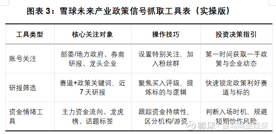 图表解读:这张表是雪球政策信号抓取的“实操手册”。比如球友关注绿氢赛道,可先关注“发改委”“兴业证券研究”账号,再搜索“绿氢+绿氢走廊”关键词筛选研报,最后通过资金流向工具跟踪美锦能源、宝丰能源的资金动态,形成“信息获取-逻辑分析-资金验证”的闭环。