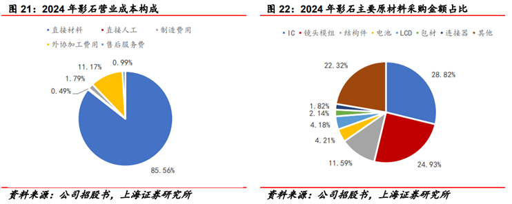 根据招股书,2024年公司营业成本中85.56%是直接材料费用。从采购金额看,IC和镜头模组占比较高,分别达到28.82%和24.93%。