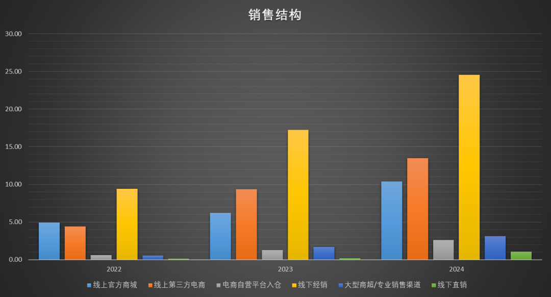 从线上线下来看,各类线上营收总占比近三年约47%左右,线下主要以经销商占比为最主要。